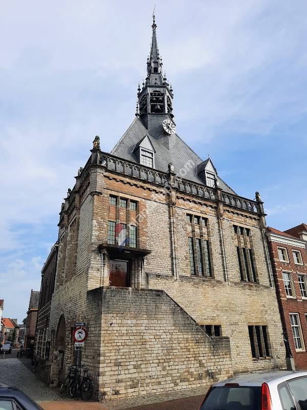Beeldbepalend 16e eeuws stadhuis met opengewerkt torentje aan de centrale gracht, recent aan de buitenkant opgeknapt. Niet gehoord: het uit 50 klokken bestaand carrillon dat open bloot in de spits hangt, de beiaardier speelt op woensdag en zaterdag. In het besterde plaveisel voor het huis zit nog een verhaal: het was vroeger een naar men zegt een 'gerechtsplaats'. Van de pek en veren zijn echter alle sporen weggepoetst, de overkluizing over de gracht vormt samen met het stadhuis een fraai ensemble.